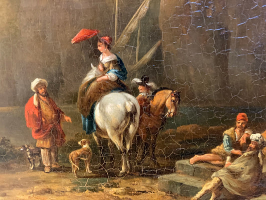 17TH CENTURY DUTCH WOMAN ON WHITE HORSE WITH FIGURES BY RIVER, NICHOLAS BERCHEM.
